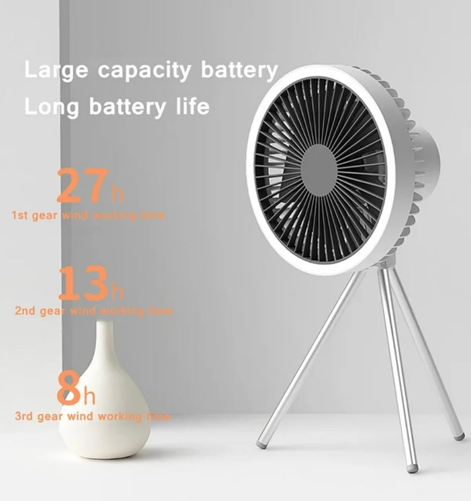 "Stay cool and well-lit on your outdoor adventures with our portable fan and LED lantern combo. This 2-in-1 device provides refreshing airflow and 360° lighting—perfect for tents, RVs, or emergency use. Rechargeable, silent, and built for the wild."